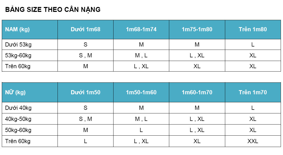 Bảng size tiêu chuẩn: